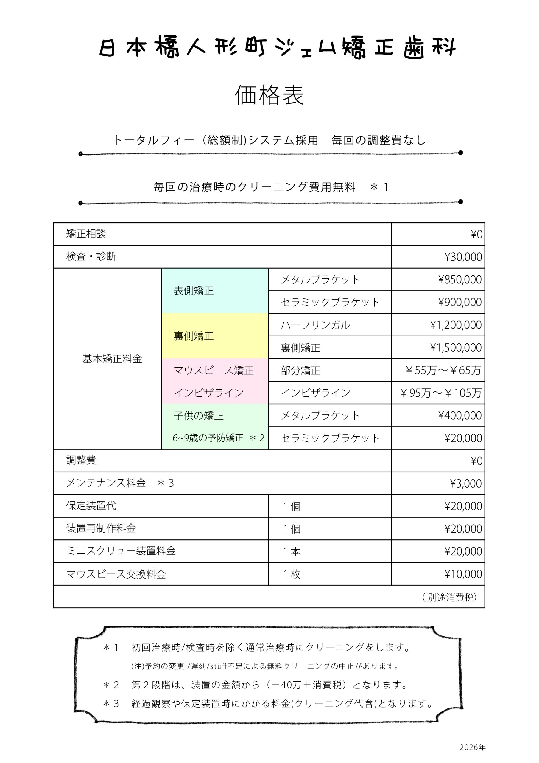 日本橋人形町ジェム矯正歯科の治療費は安心の定額制(トータルフィー)です
